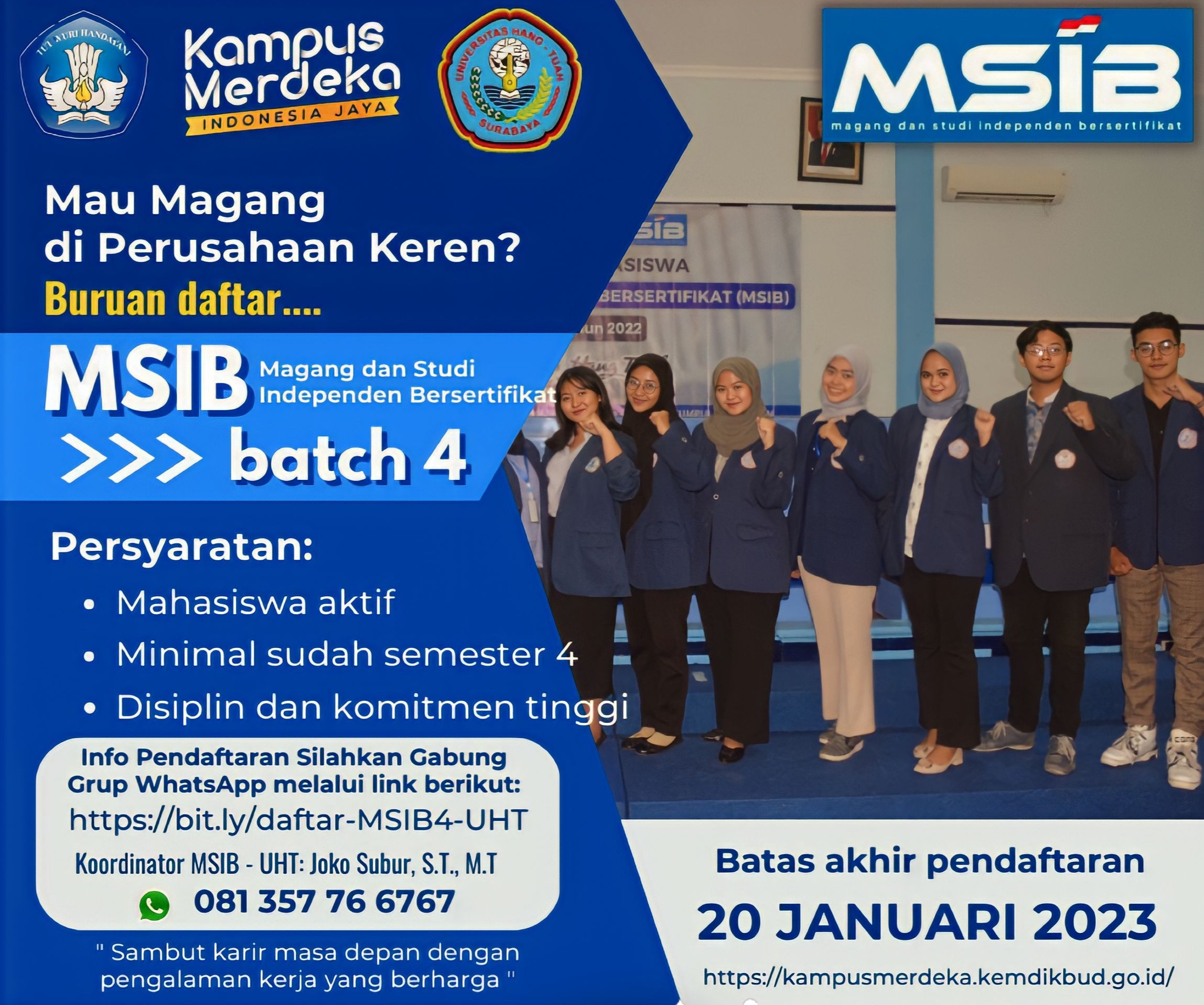 MSIB adalah Program Magang dan Studi Independen Bersertifikat Kampus Merdeka memberikan kesempatan kepada mahasiswa untuk mengasah dan mendapatkan kemampuan, pengetahuan dan sikap di dunia industri dengan cara bekerja dan belajar secara langsung dalam proyek atau permasalahan riil. Pengalaman belajar di luar perguruan tinggi selama lebih dari 16 minggu hingga 24 minggu dengan aktivitas pembelajaran yang terstruktur akan dikonversi ke SKS Mahasiswa.